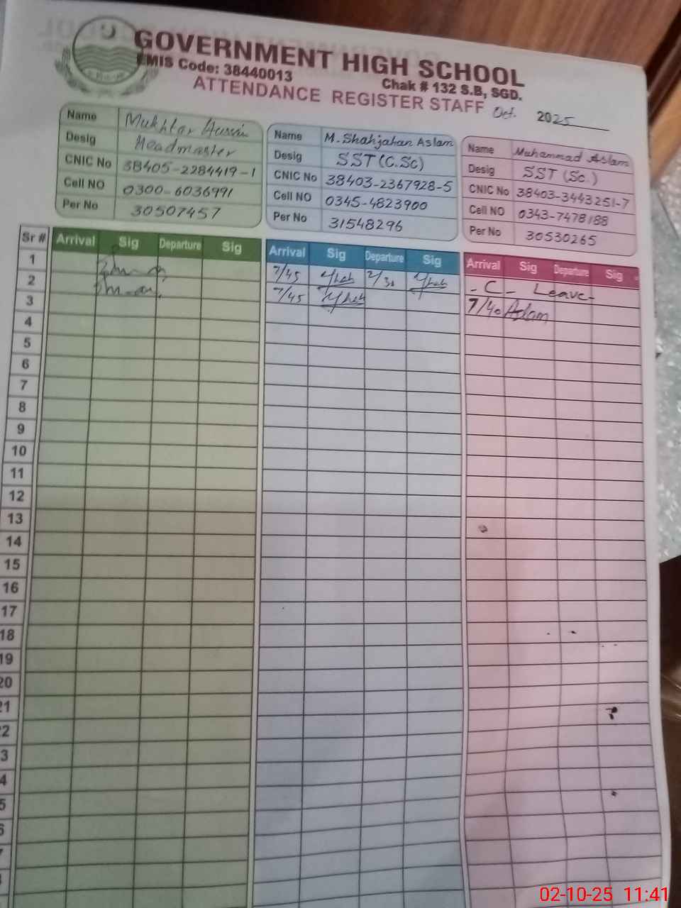 | CNIC | Full Name | Designation | R/C | Absence during last cal. month |