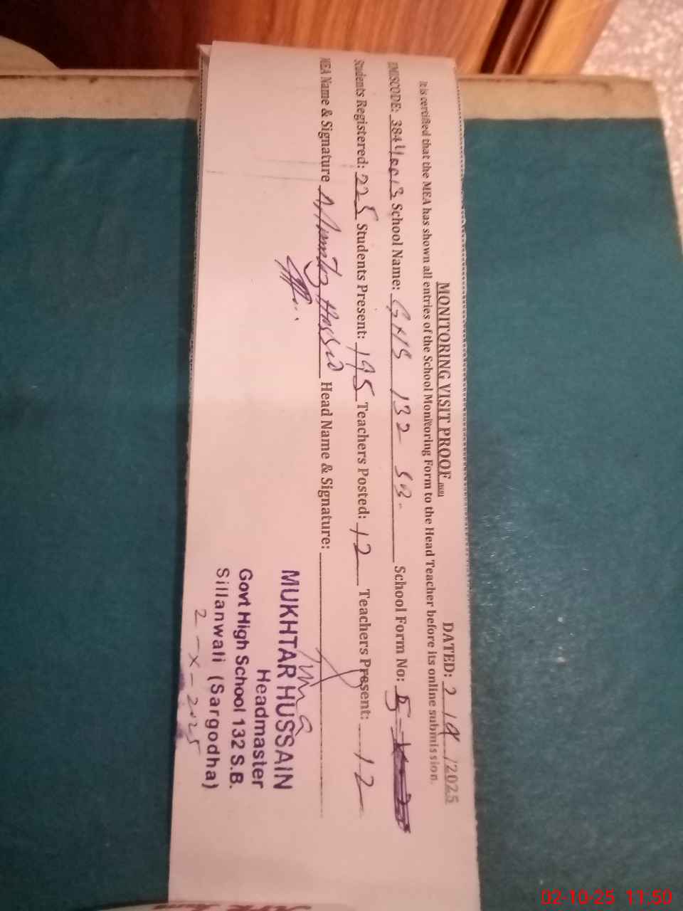 | Attendance Register | Head Teacher | MEA with School | Visit Proof |