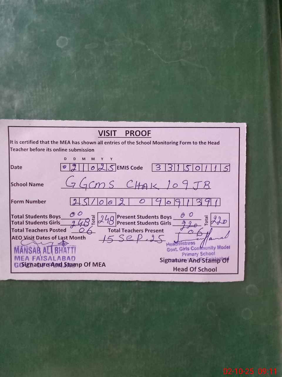 | Certified that this School was Inspected by the Undersigned MEA/DMO Today and the Information Stated Above is as Per Record. | |||||