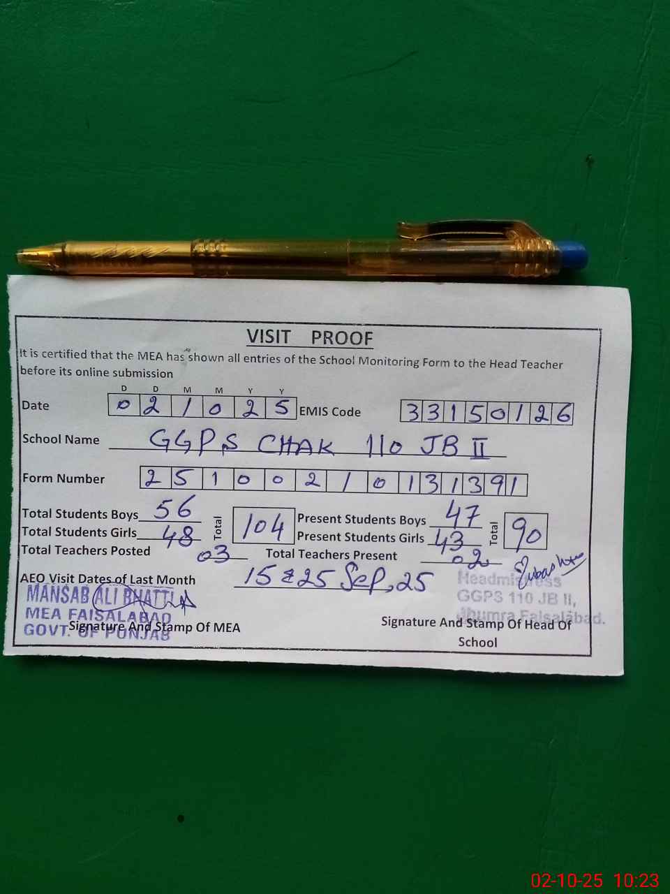 | EMIS Code: 33150126 | Name of School: GGPS CHAK 110 JB II | |||