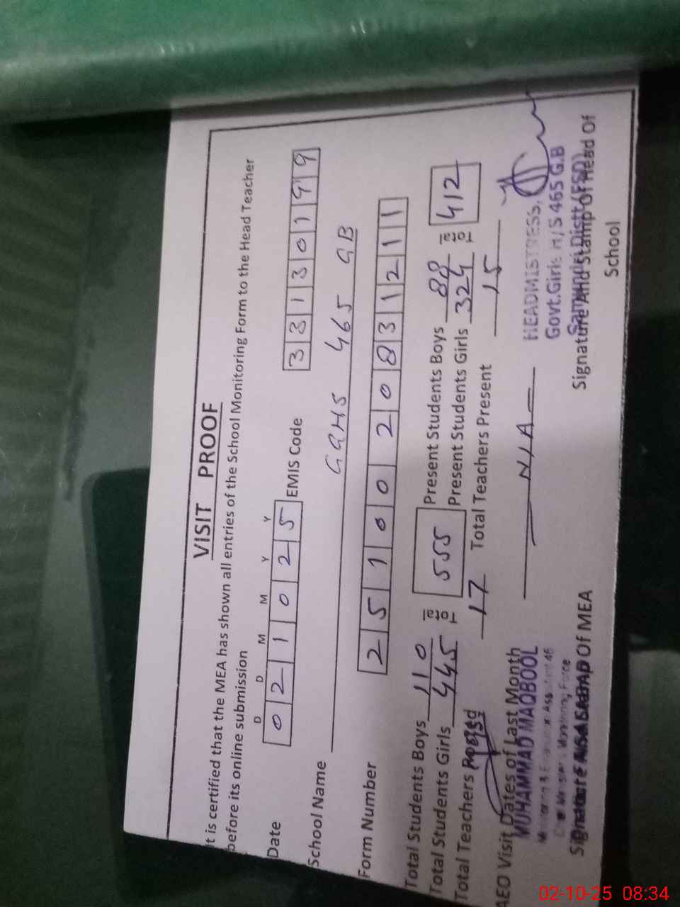 | Attendance Register | Head Teacher | MEA with School | Visit Proof |