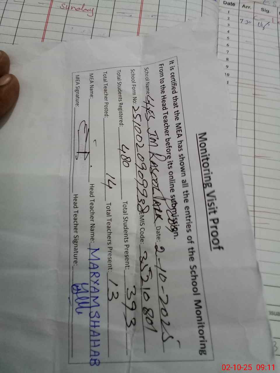 | Attendance Register | Head Teacher | MEA with School | Visit Proof |