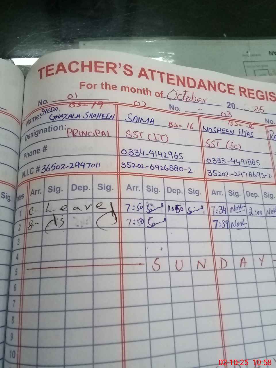 | CNIC | Full Name | Designation | R/C | Absence During Last Calender Month |