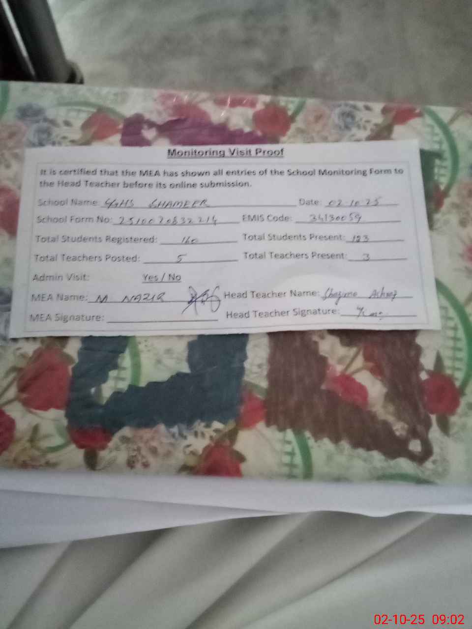 | Attendance Register | Head Teacher | MEA with School | Visit Proof |