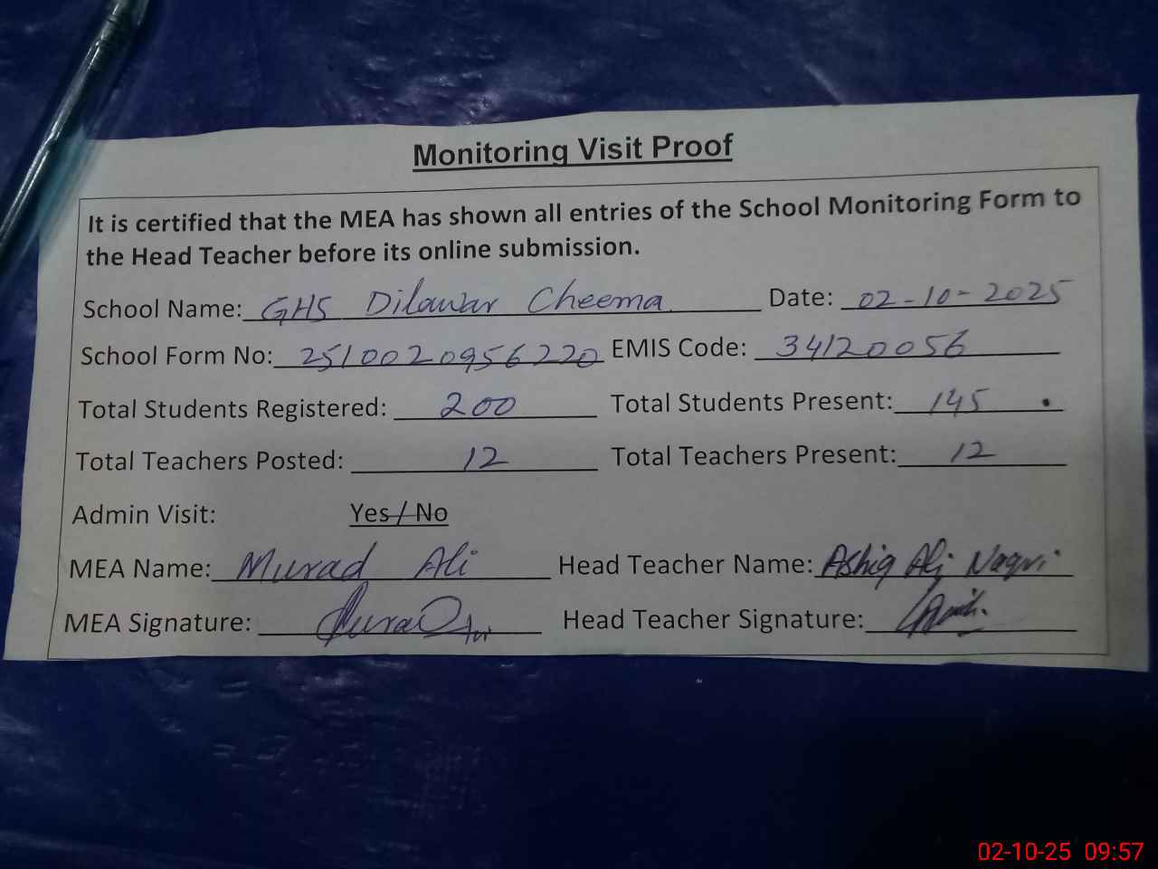 | Attendance Register | Head Teacher | MEA with School | Visit Proof |