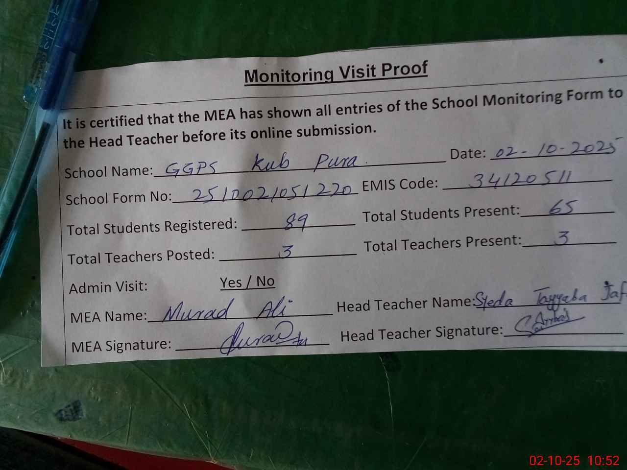 | EMIS Code: 34120511 | Name of School: GGPS KUB PURA | |||