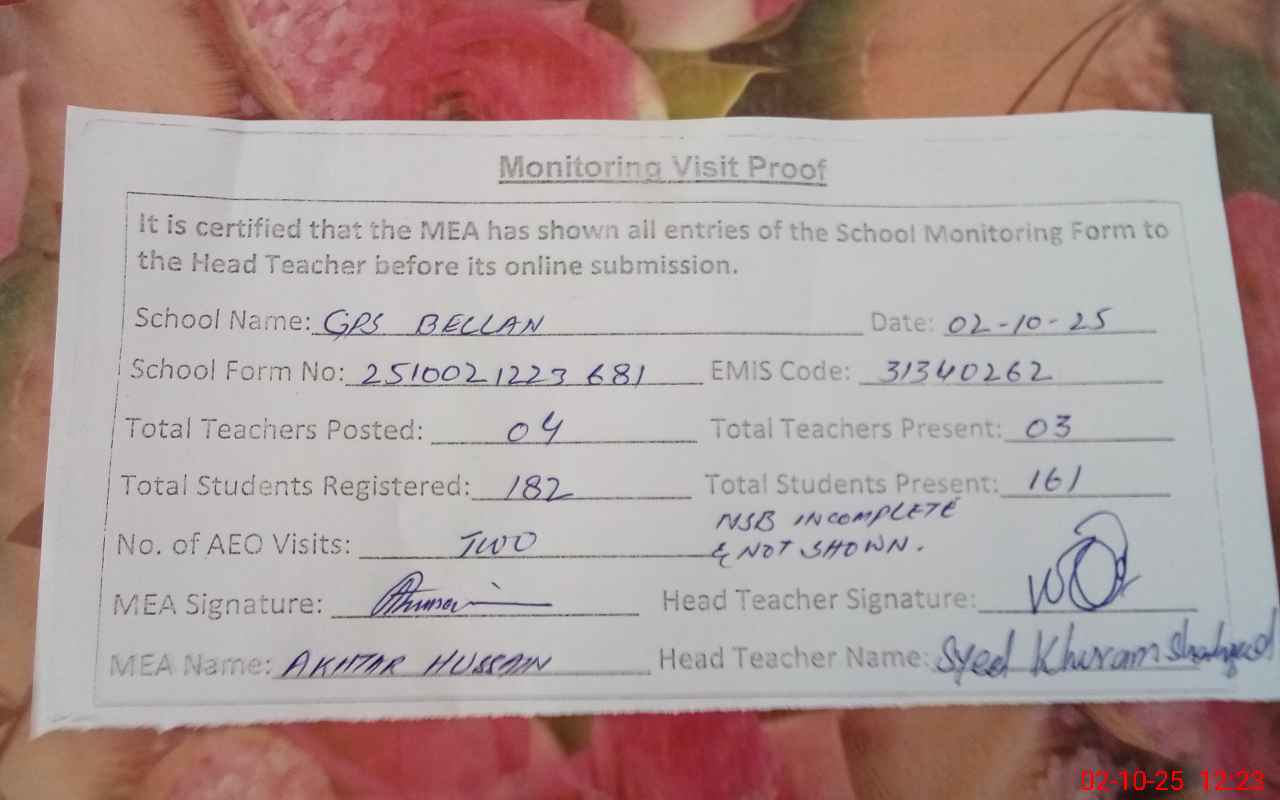 | Certified that this School was Inspected by the Undersigned MEA/DMO Today and the Information Stated Above is as Per Record. | |||||