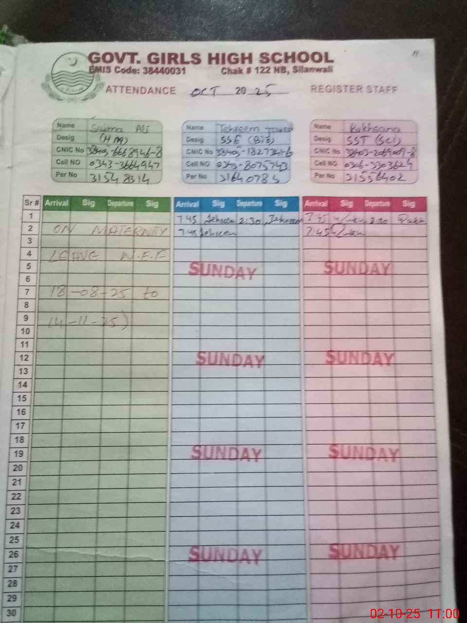 | CNIC | Full Name | Designation | R/C | Absence during last cal. month |