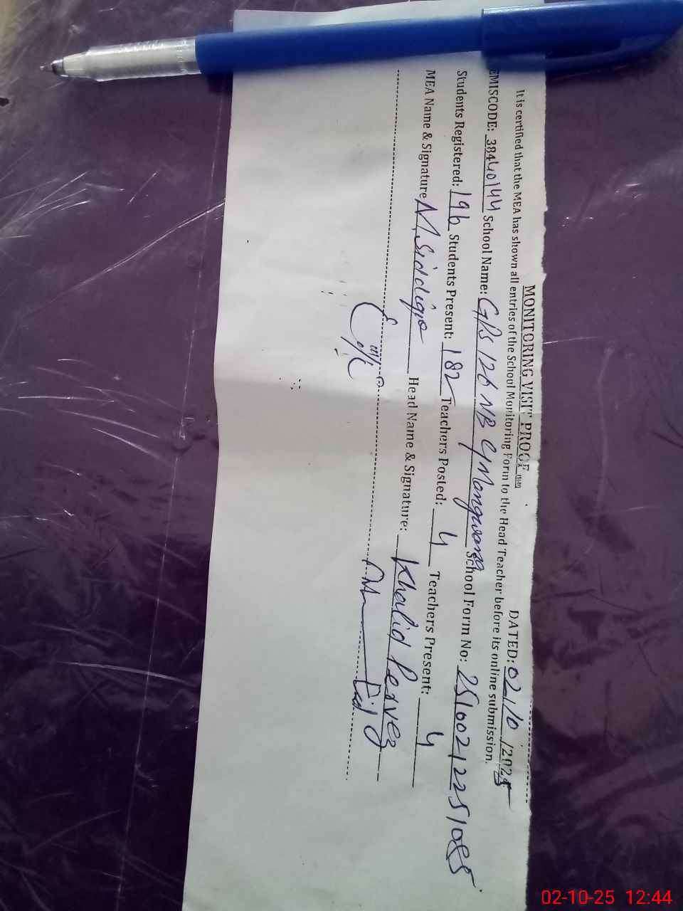 | Certified that this School was Inspected by the Undersigned MEA/DMO Today and the Information Stated Above is as Per Record. | |||||