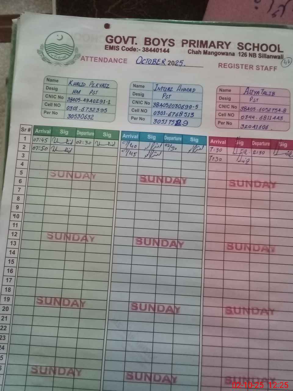 | CNIC | Full Name | Designation | R/C | Absence during last cal. month |