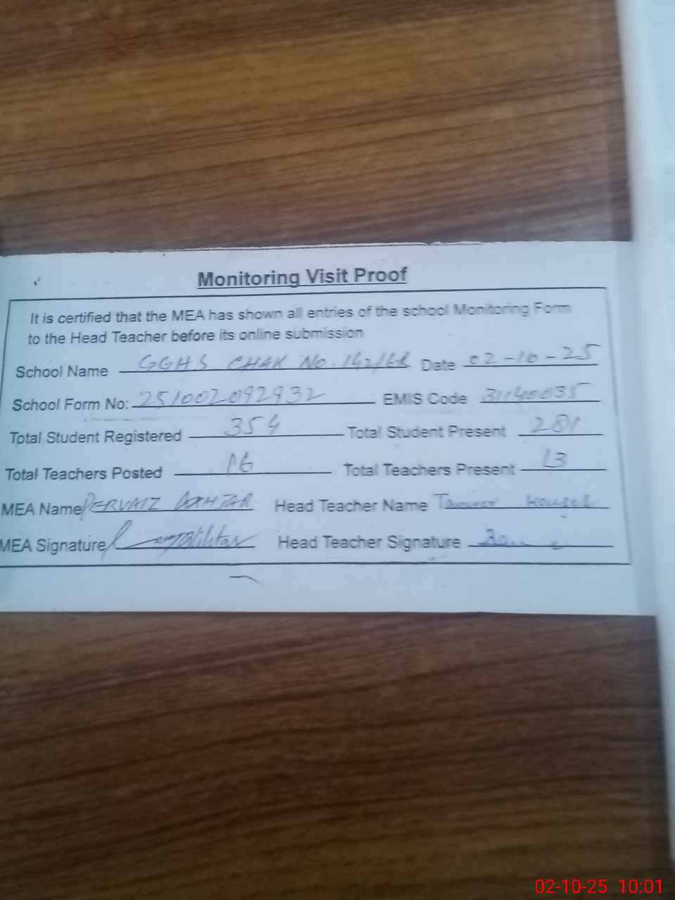 | Attendance Register | Head Teacher | MEA with School | Visit Proof |