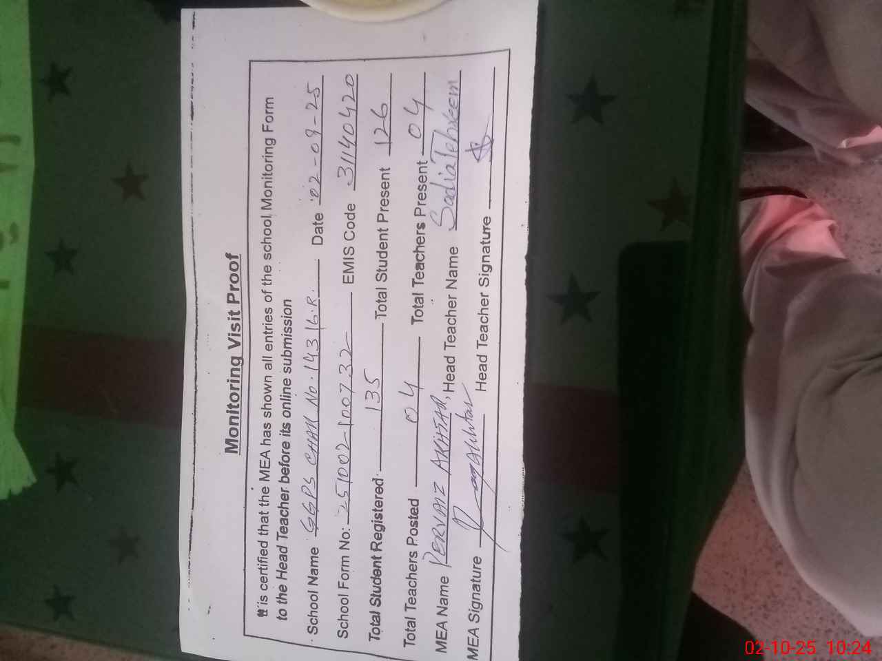 | Attendance Register | Head Teacher | MEA with School | Visit Proof |