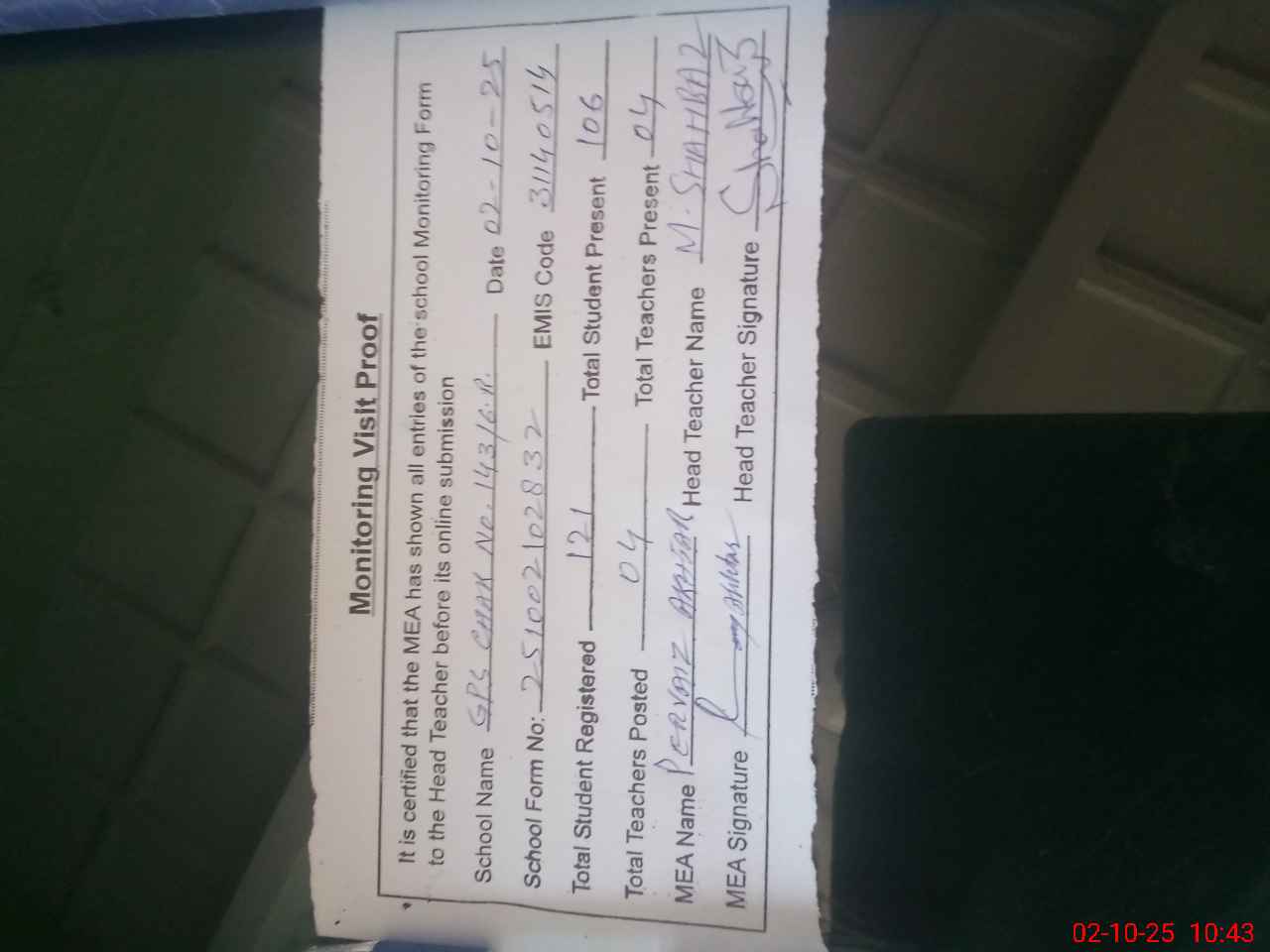 | Attendance Register | Head Teacher | MEA with School | Visit Proof |