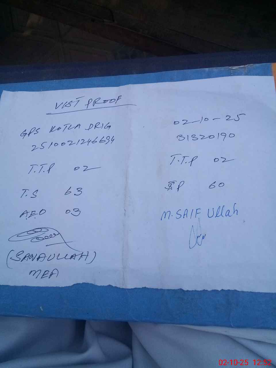 | Monitoring Date: 02-10-2025 | Start Time: 02-10-2025 12:35 PM | End Time: 02-10-2025 12:54 PM | Name of MEA: Mu**** Sa**** Ul**** Sa**** | |