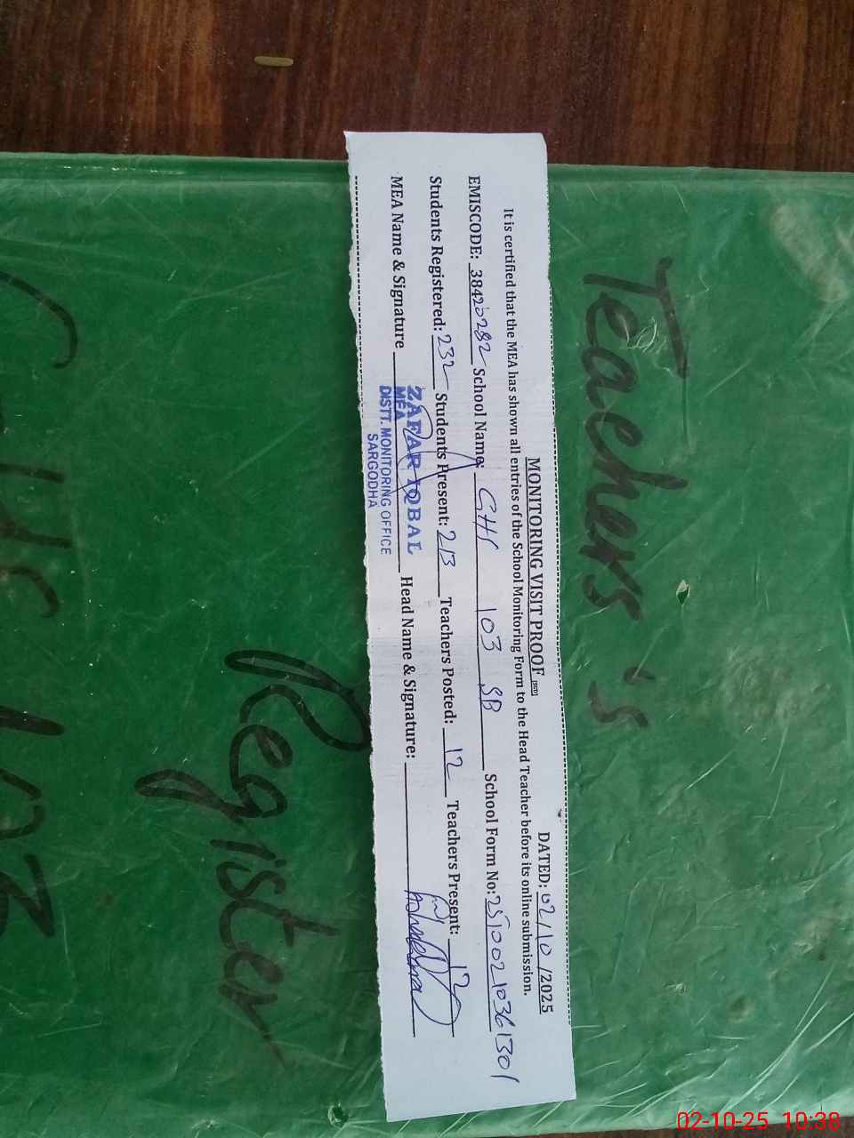 | Attendance Register | Head Teacher | MEA with School | Visit Proof |