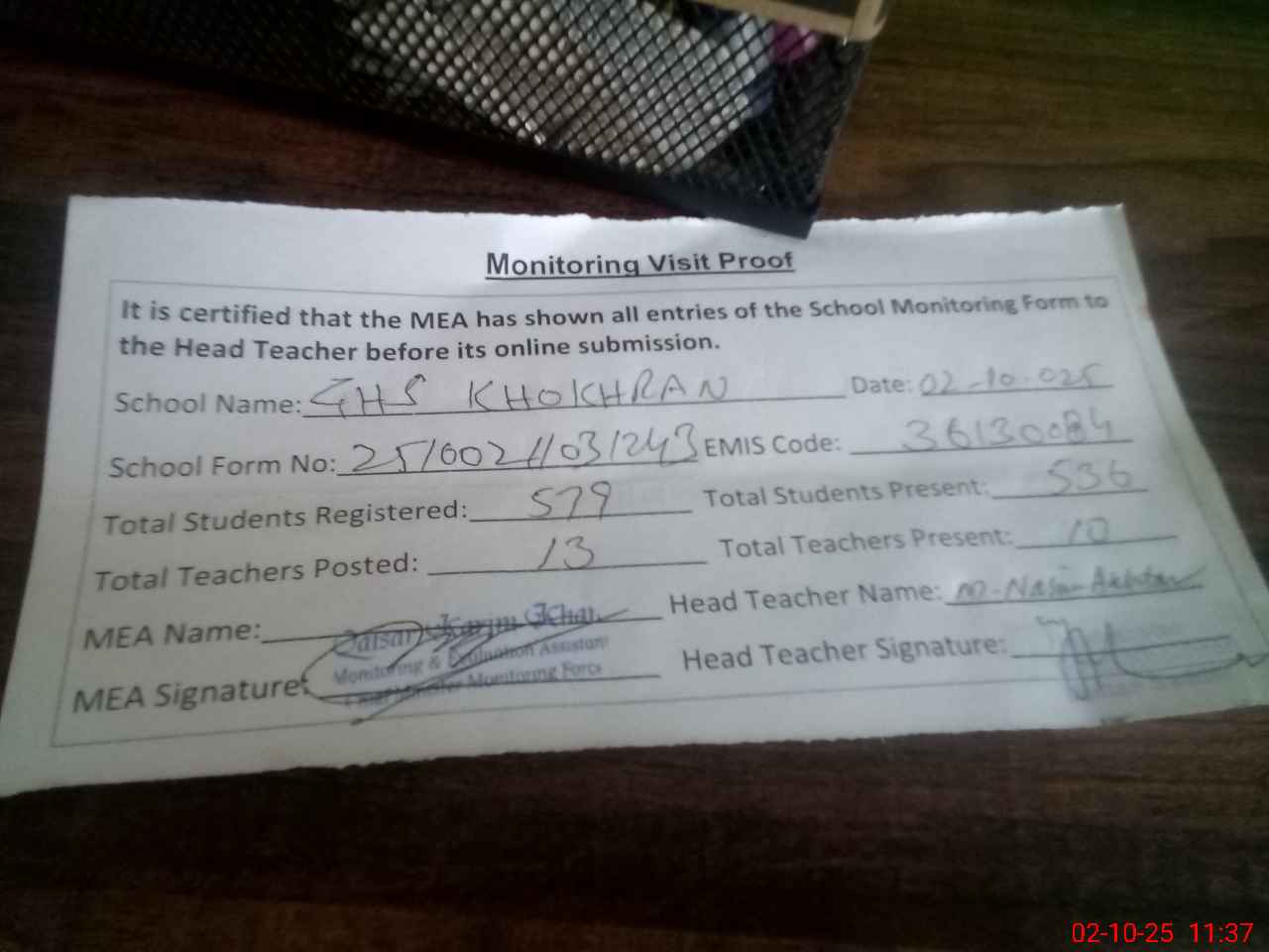 | Attendance Register | Head Teacher | MEA with School | Visit Proof |