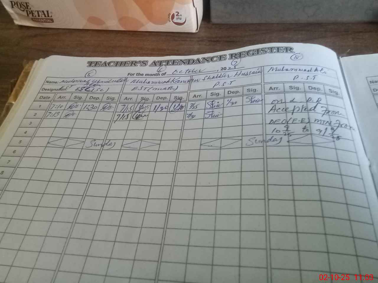 | CNIC | Full Name | Designation | R/C | Absence During Last Calender Month |