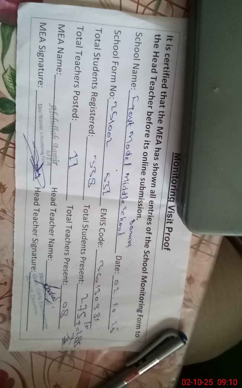 | EMIS Code: 36130381 | Name of School: Govt. Model Middle School Domra Multan | |||