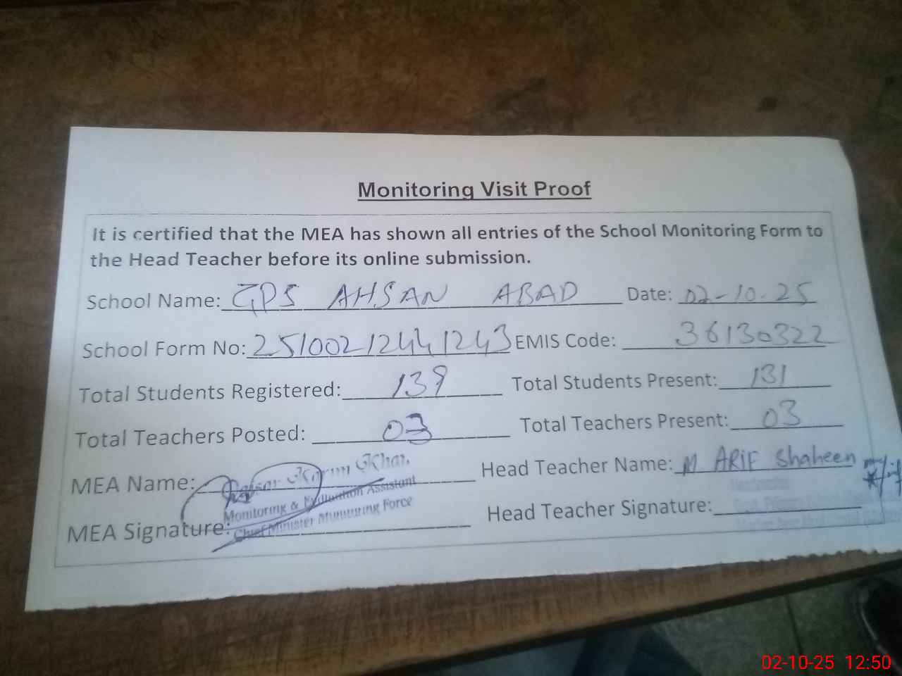 | Attendance Register | Head Teacher | MEA with School | Visit Proof |