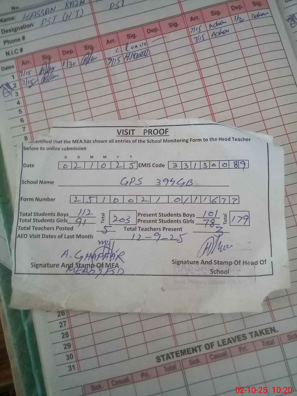 | Remarks (Use Separate Page if Required): HEADTEACHER PST HASSAN RAZA MARKED PRESENT BUT PHYSICALLY FOUND ABSENT AND CAME AFTER MEA ARRIVAL TEACHER ASHFAQ AHMAD FOUND ABSENT DRINKING WATER NOT AVAILABLE IN SCHOOL NSB ABND FTF REGISTER NOT AVAILABLE IN SCHOOL | |||||