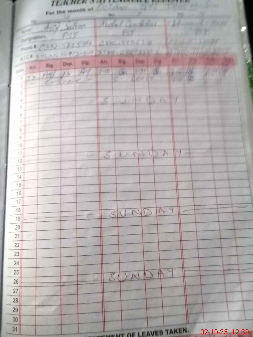 | CNIC | Full Name | Designation | R/C | Absence During Last Calender Month |