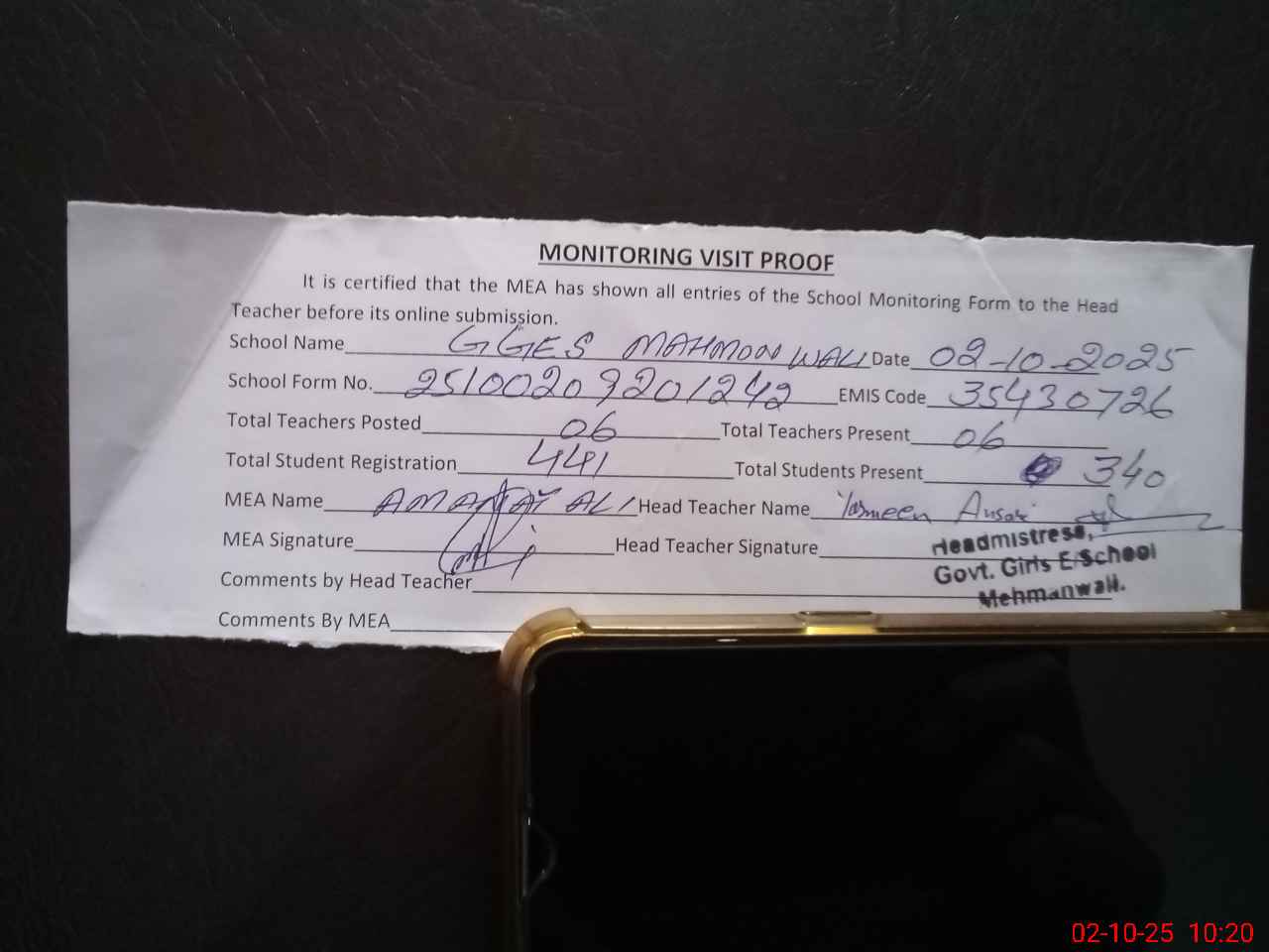 | Attendance Register | Head Teacher | MEA with School | Visit Proof |
