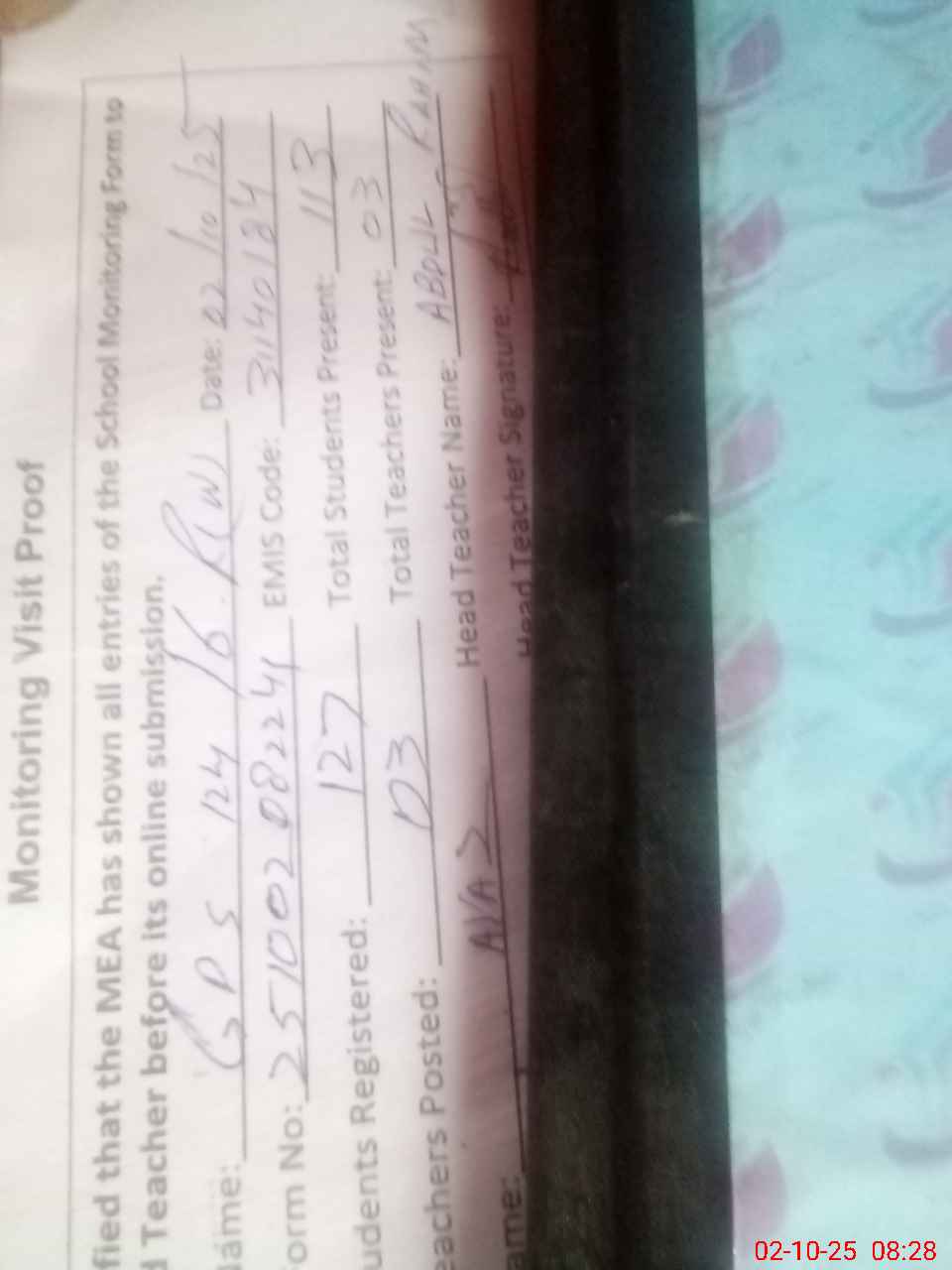 | Attendance Register | Head Teacher | MEA with School | Visit Proof |