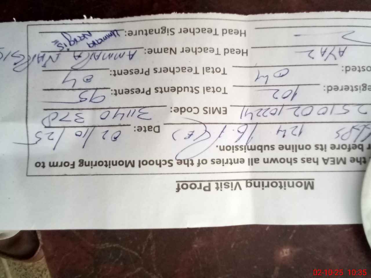 | Monitoring Date: 02-10-2025 | Start Time: 02-10-2025 10:13 AM | End Time: 02-10-2025 10:35 AM | Name of MEA: Ay**** Me**** BN**** 13 | |