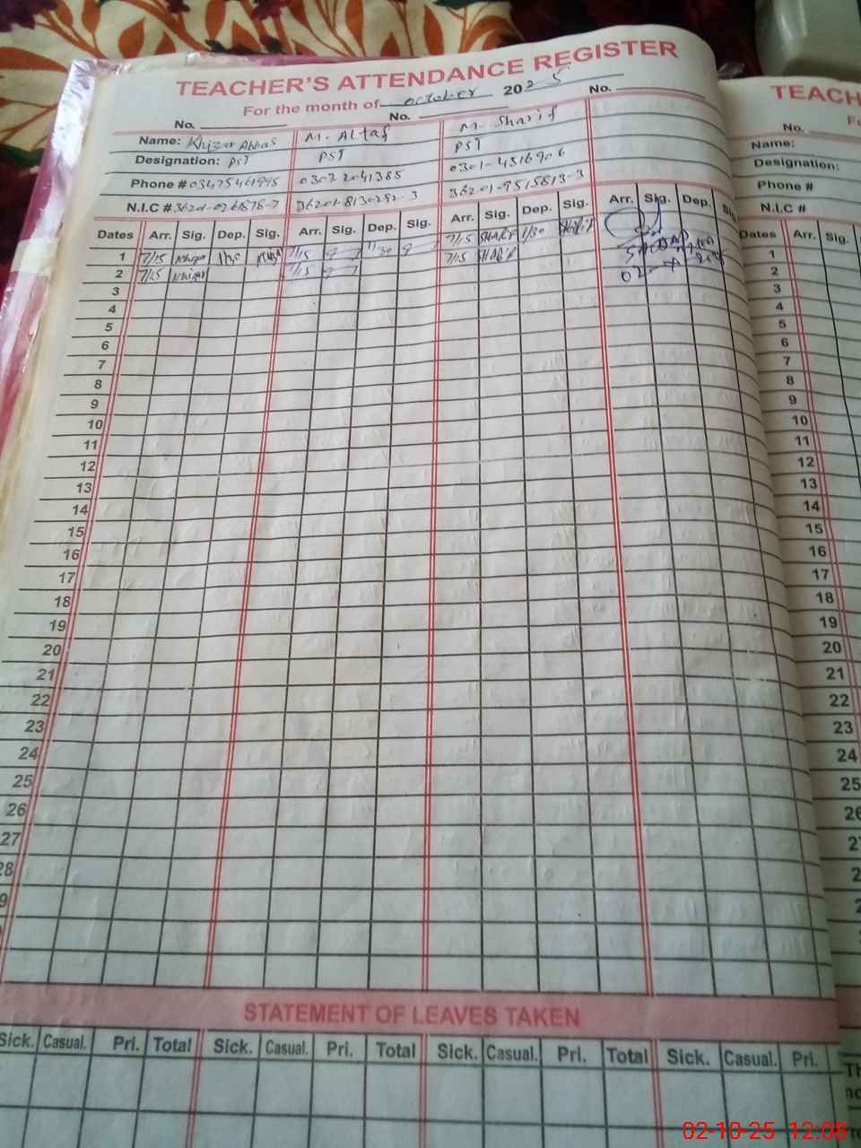 | CNIC | Full Name | Designation | R/C | Absence during last cal. month |