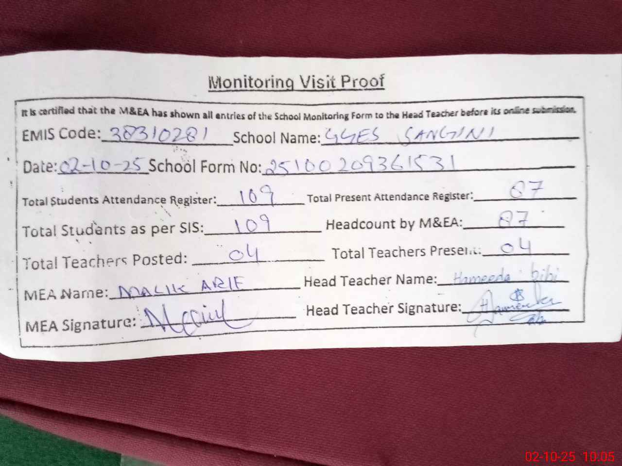 | Attendance Register | Head Teacher | MEA with School | Visit Proof |