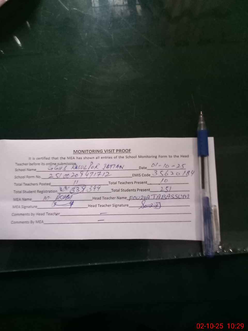 | Monitoring Date: 02-10-2025 | Start Time: 02-10-2025 09:35 AM | End Time: 02-10-2025 10:39 AM | Name of MEA: Mu**** As**** | |