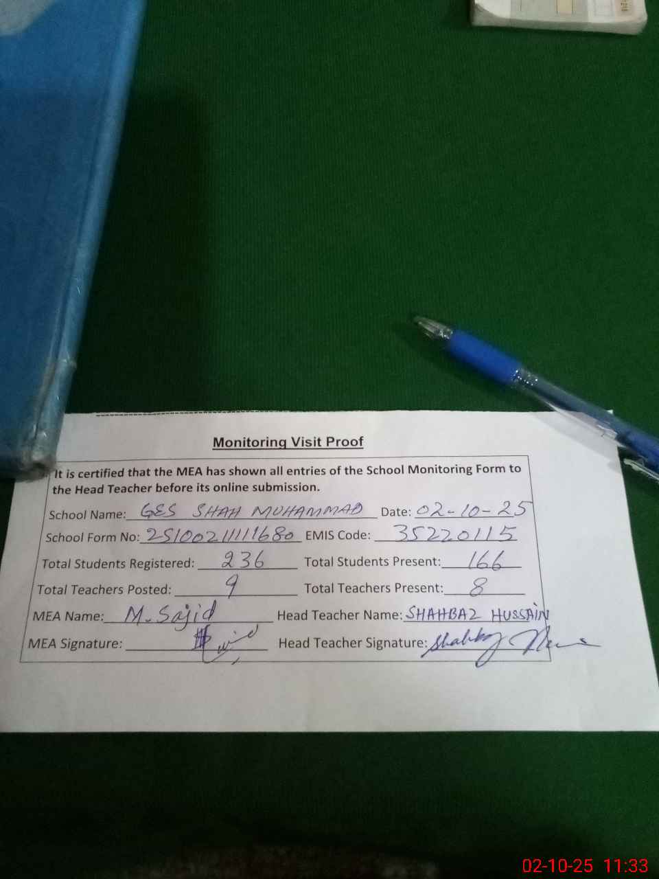 | Certified that this School was Inspected by the Undersigned MEA/DMO Today and the Information Stated Above is as Per Record. | |||||