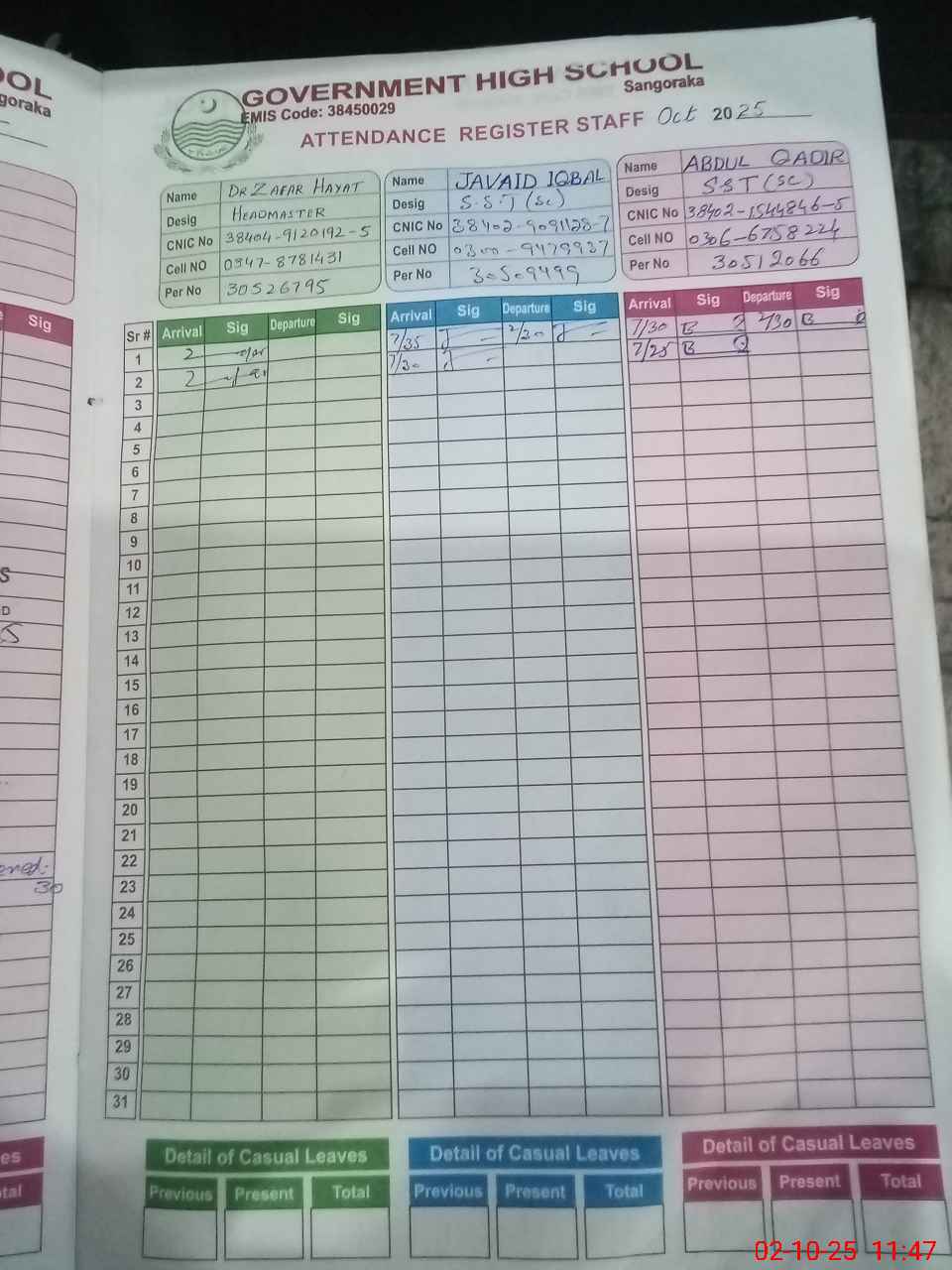 | CNIC | Full Name | Designation | R/C | Absence during last cal. month |
