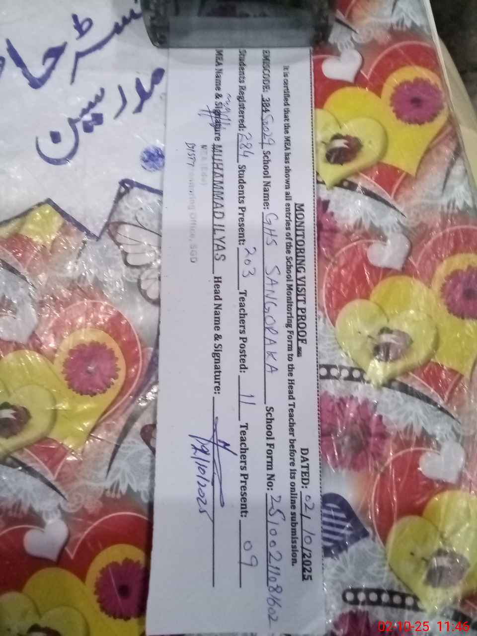 | Certified that this School was Inspected by the Undersigned MEA/DMO Today and the Information Stated Above is as Per Record. | |||||