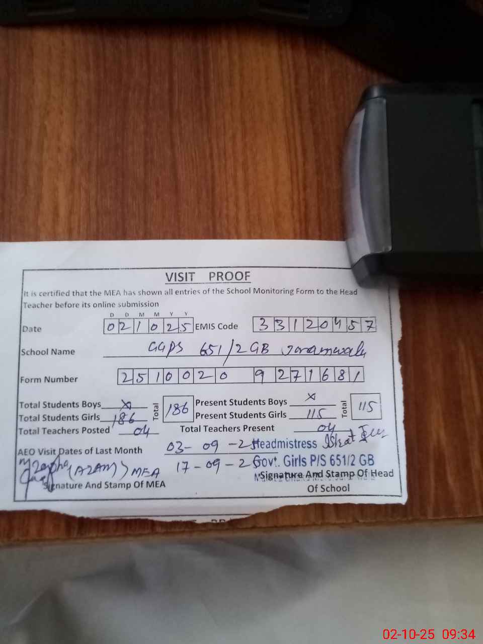 | Certified that this School was Inspected by the Undersigned MEA/DMO Today and the Information Stated Above is as Per Record. | |||||