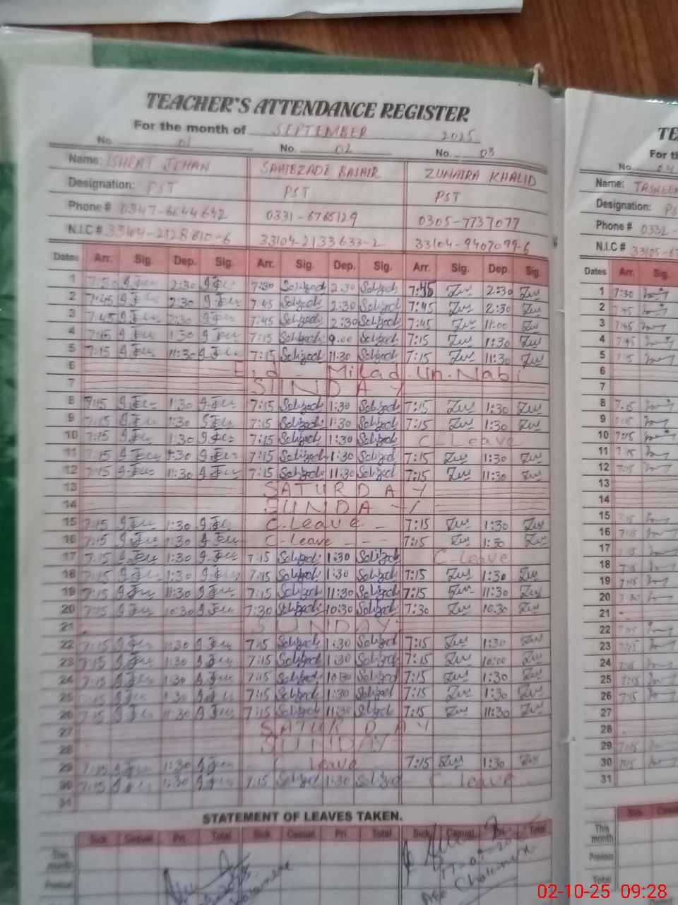 | CNIC | Full Name | Designation | R/C | Absence During Last Calender Month |