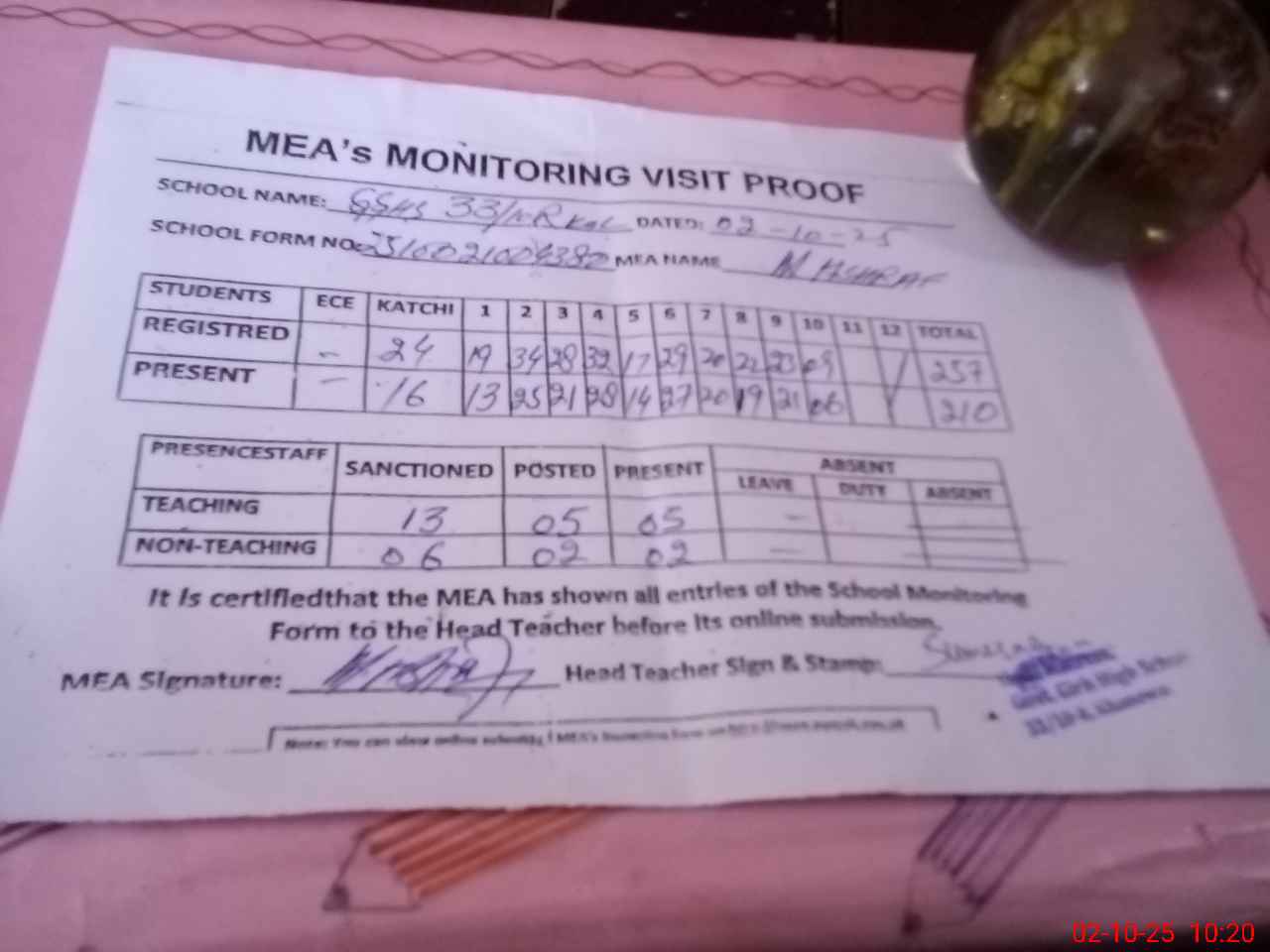 | Attendance Register | Head Teacher | MEA with School | Visit Proof |