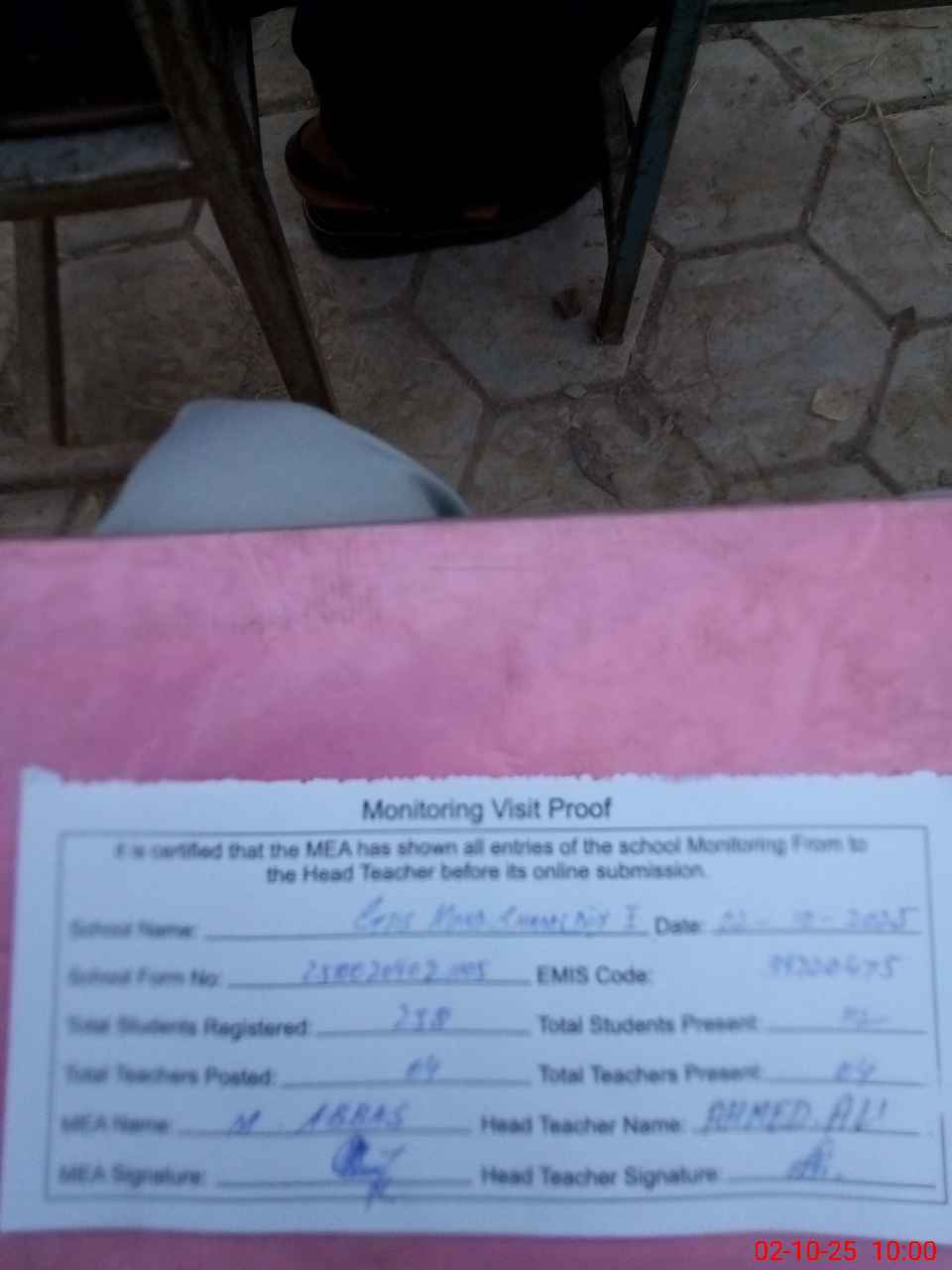 | Attendance Register | Head Teacher | MEA with School | Visit Proof |