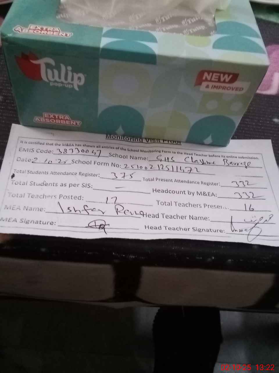 | Attendance Register | Head Teacher | MEA with School | Visit Proof |