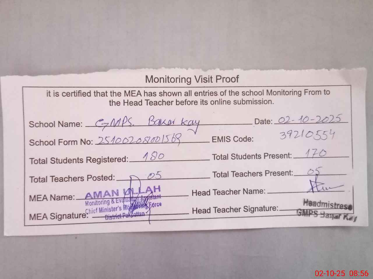 | Attendance Register | Head Teacher | MEA with School | Visit Proof |
