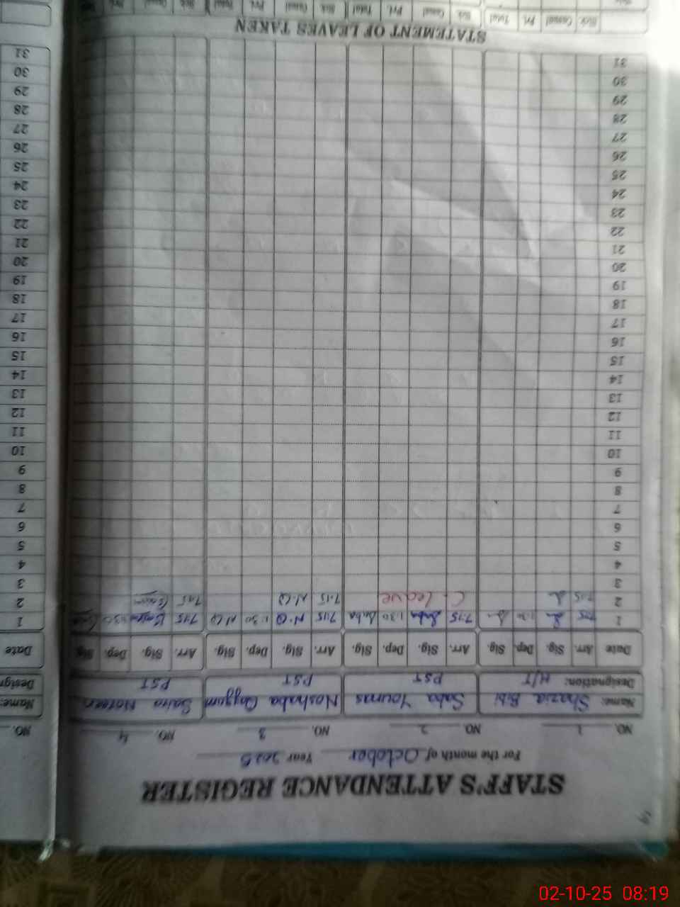 | CNIC | Full Name | Designation | R/C | Absence During Last Calender Month |