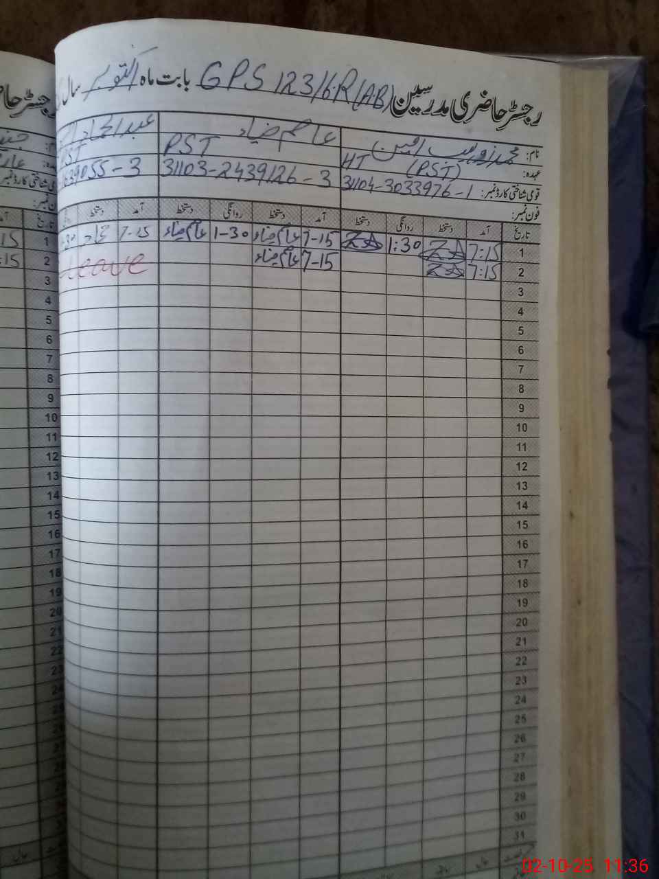 | CNIC | Full Name | Designation | R/C | Absence during last cal. month |