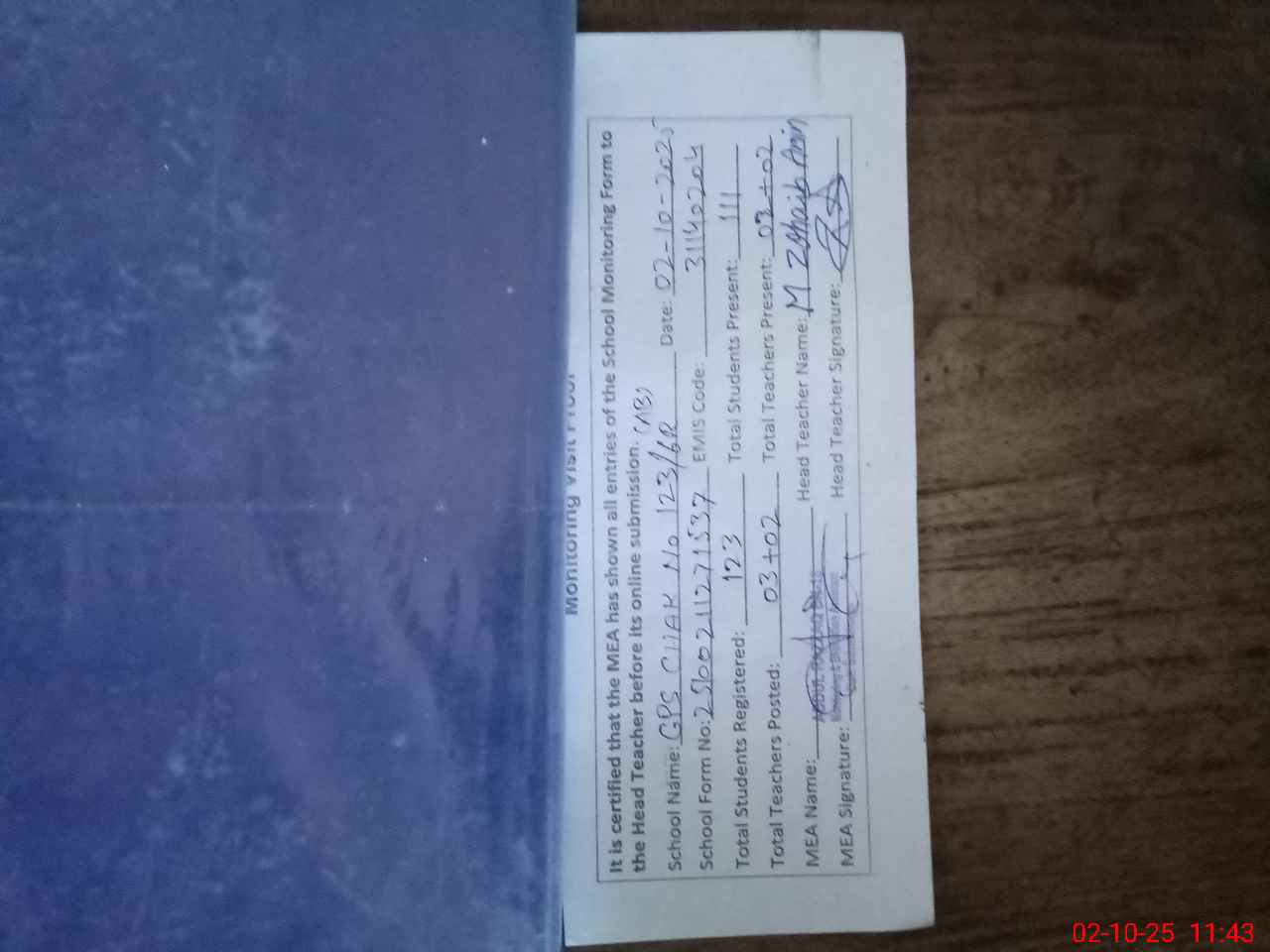 | Attendance Register | Head Teacher | MEA with School | Visit Proof |