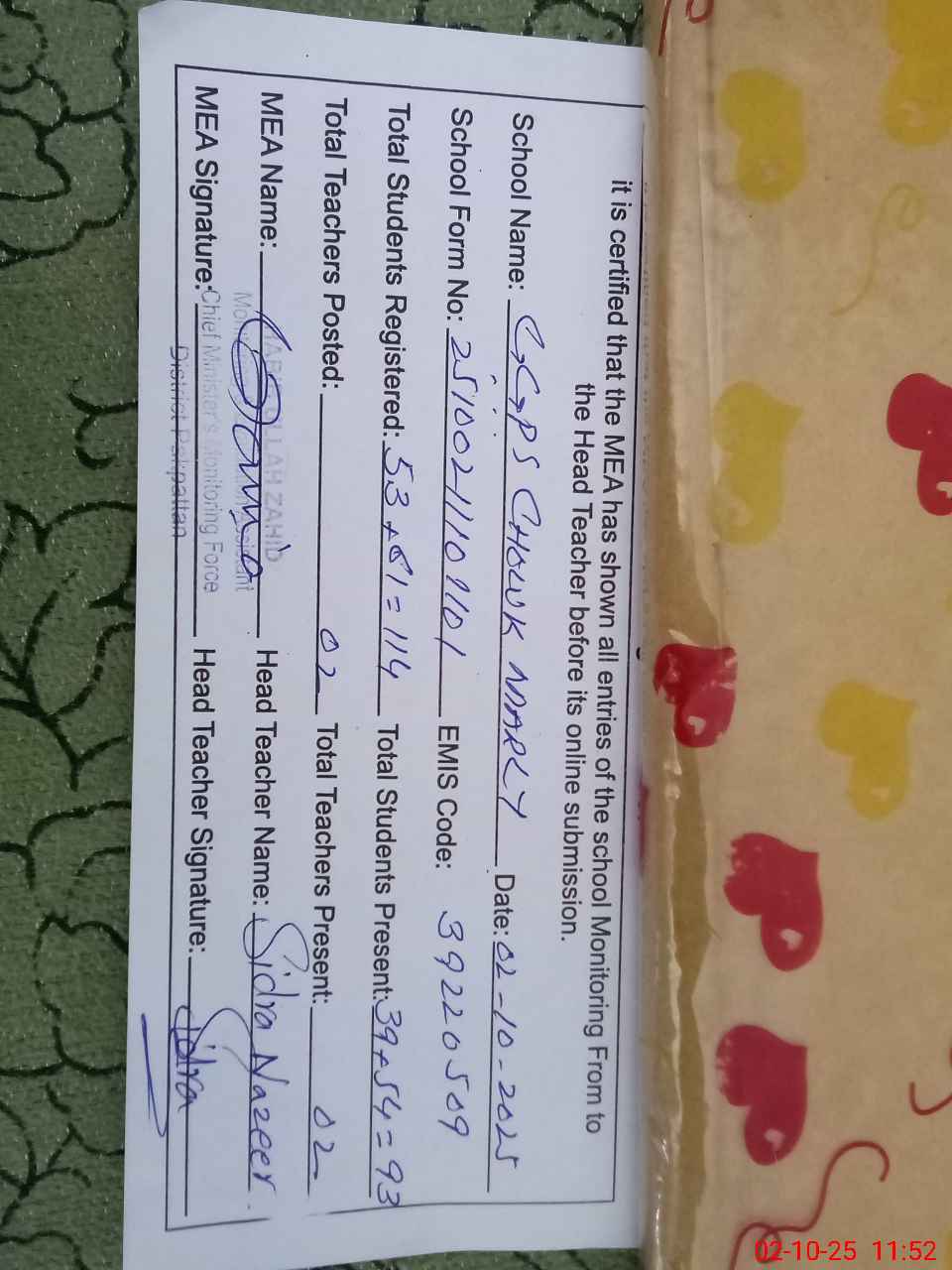 | EMIS Code: 39220509 | Name of School: GGPS CHOWK MARLAY | |||