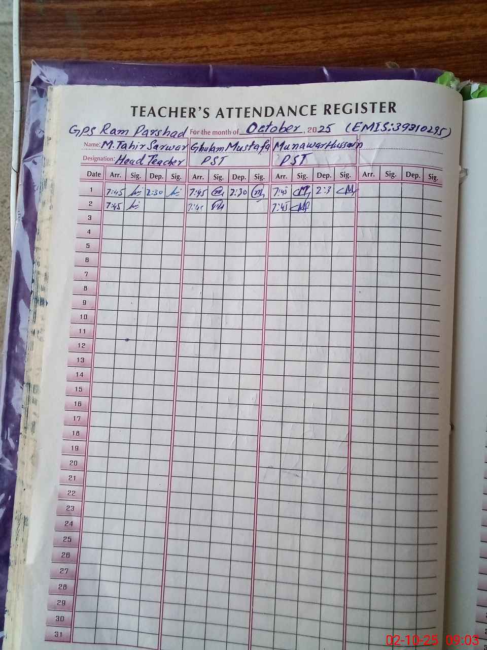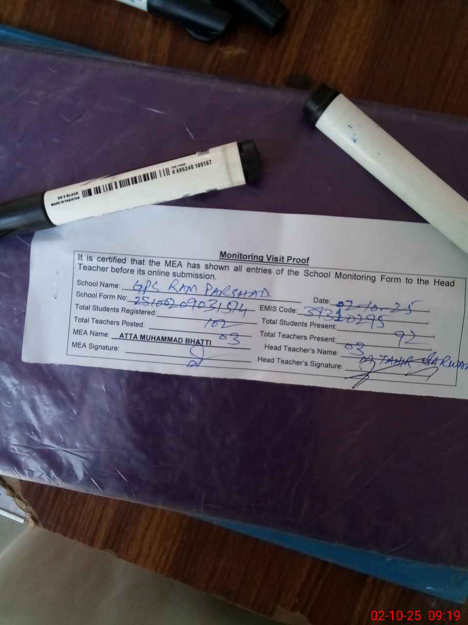 | Attendance Register | Head Teacher | MEA with School | Visit Proof |