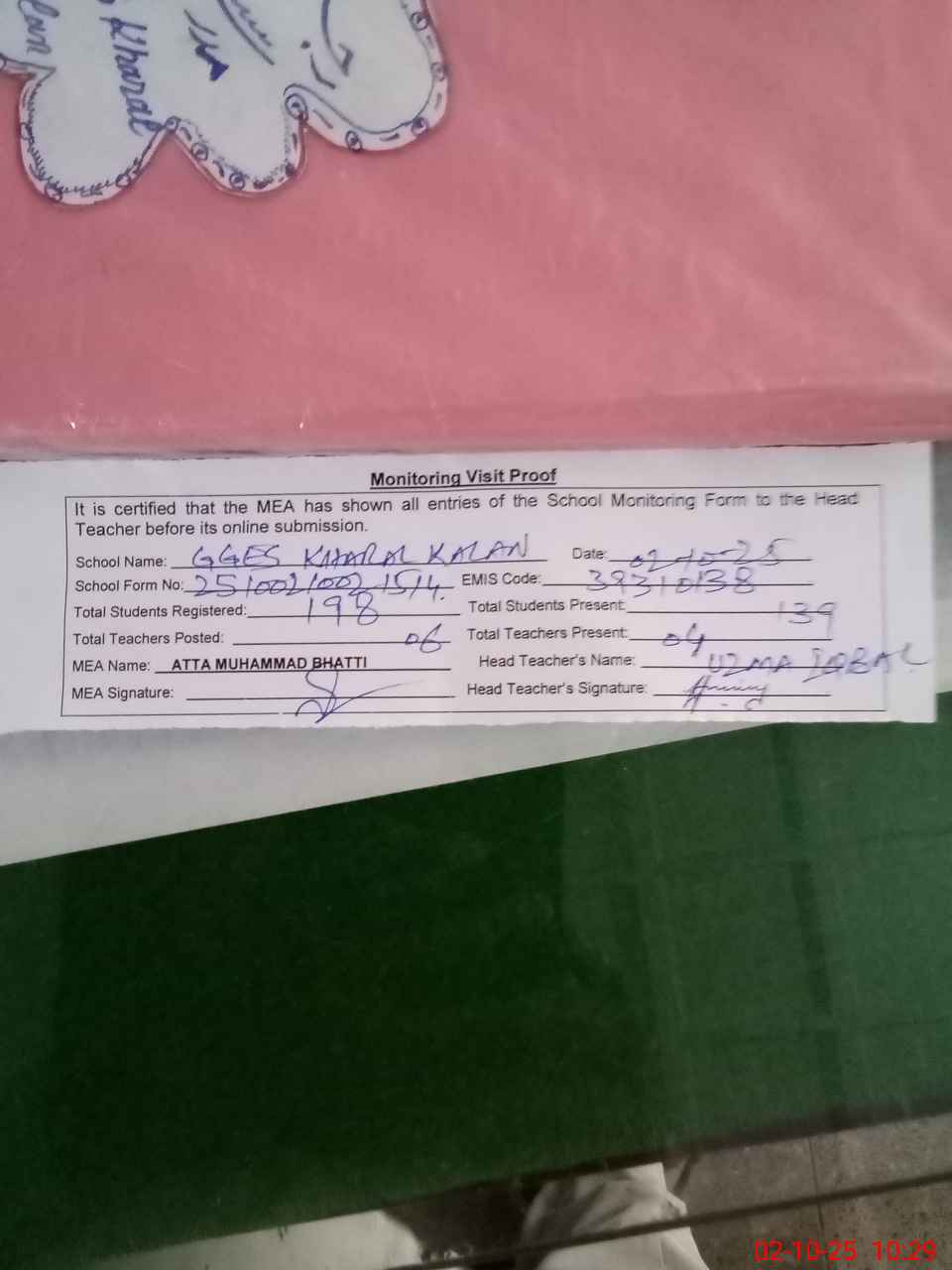 | Attendance Register | Head Teacher | MEA with School | Visit Proof |
