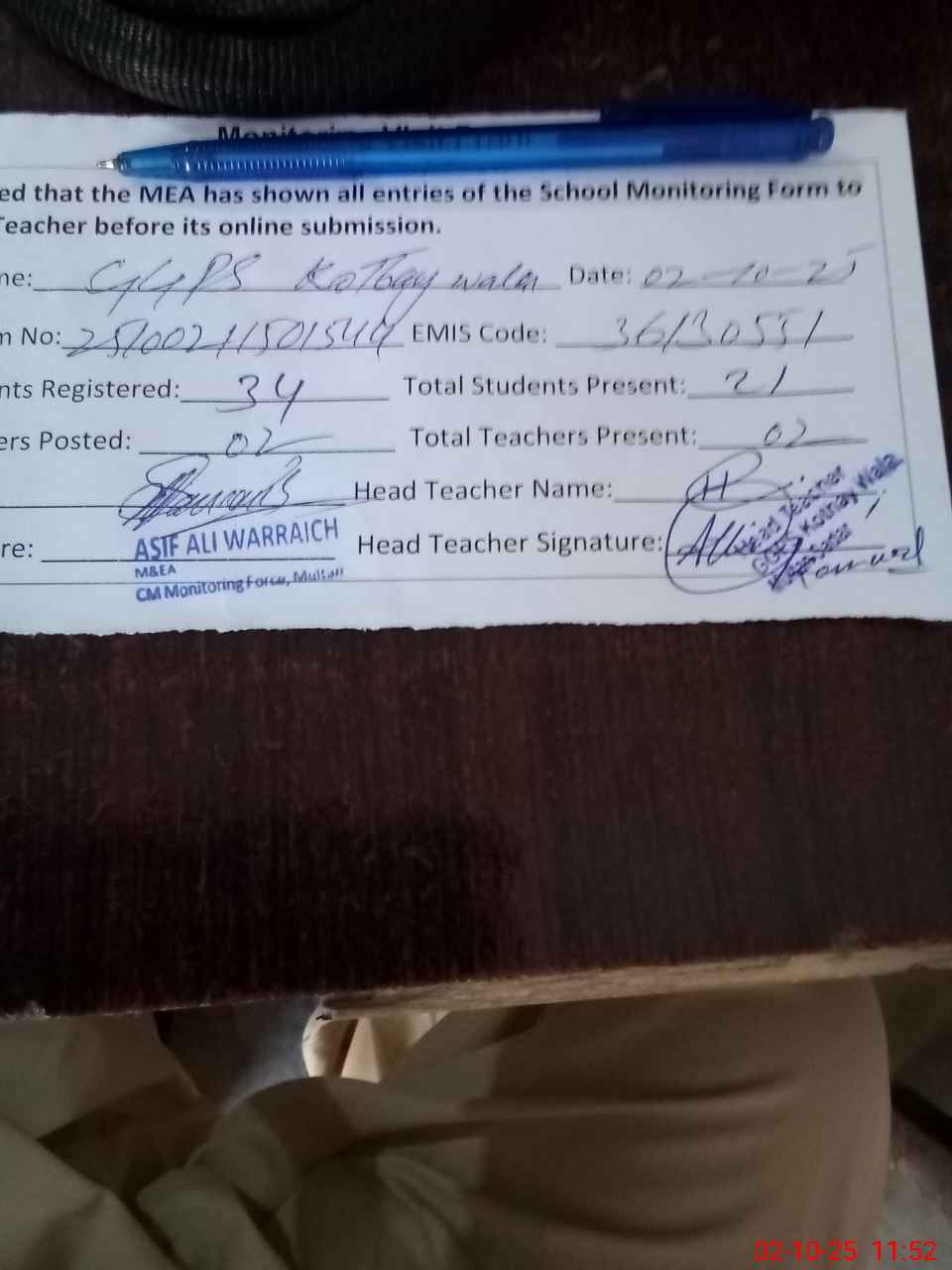 | Attendance Register | Head Teacher | MEA with School | Visit Proof |