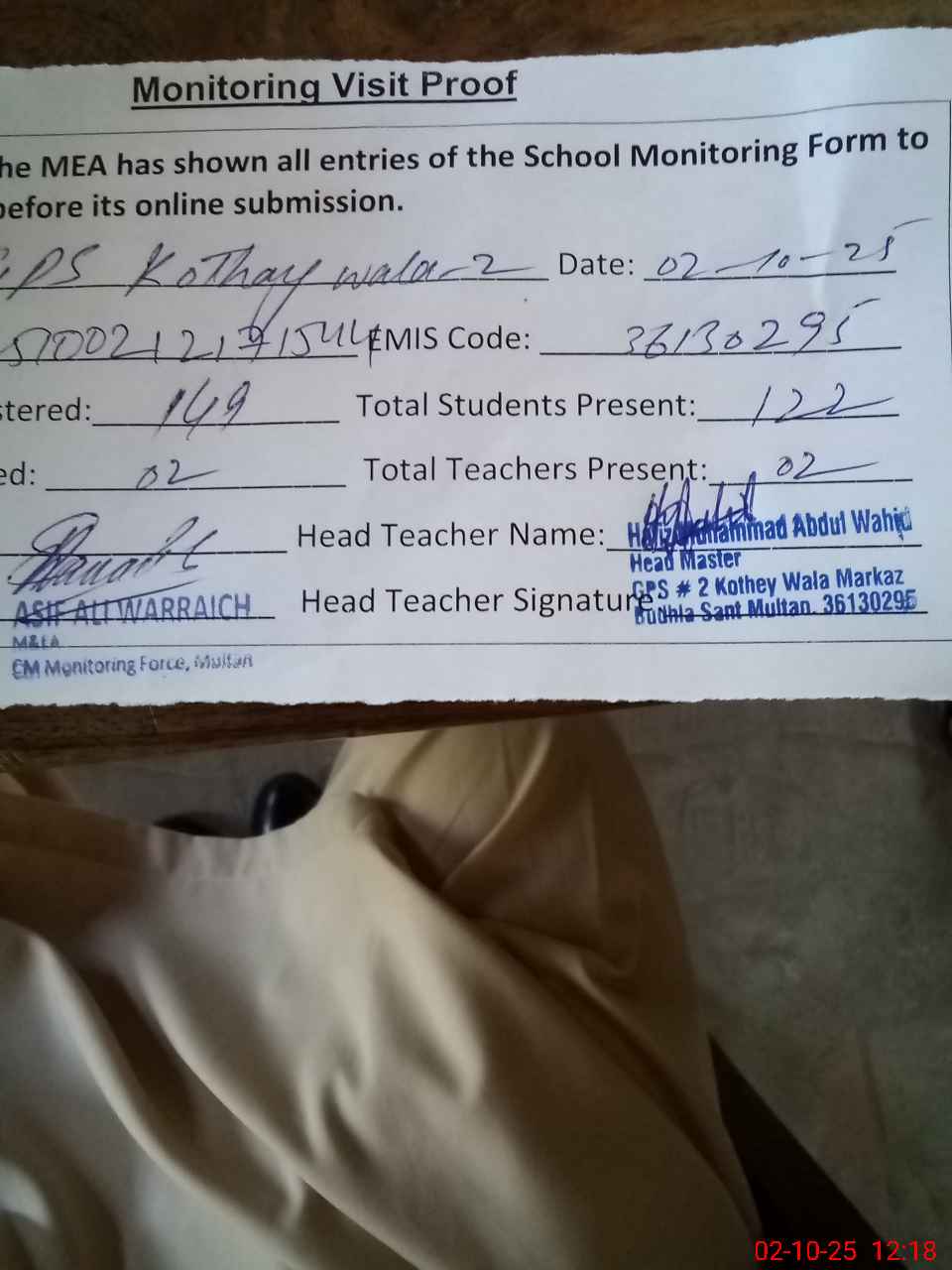 | EMIS Code: 36130295 | Name of School: GPS KOTHEY WALA NO. 2 MULTAN | |||