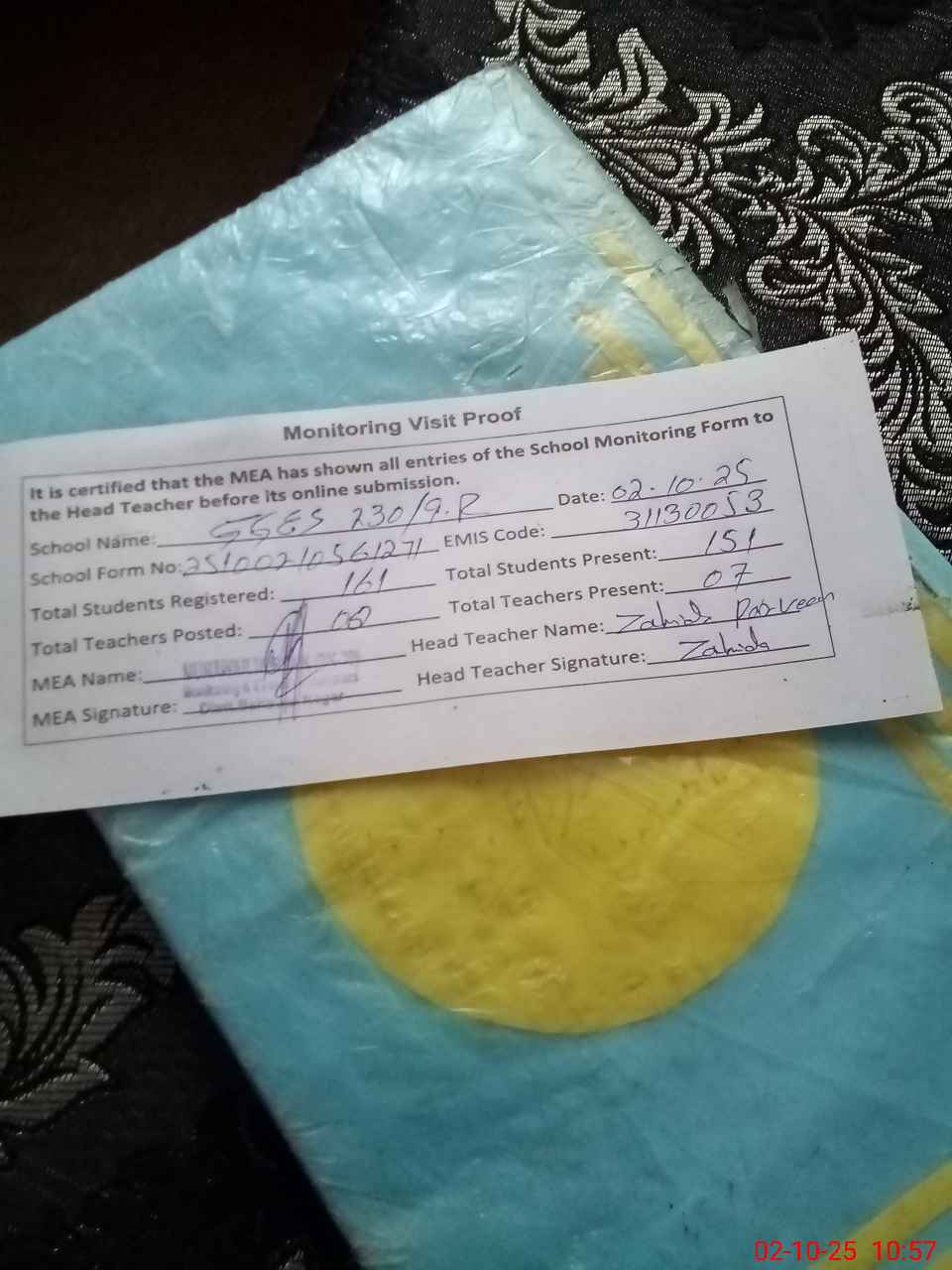 | Attendance Register | Head Teacher | MEA with School | Visit Proof |