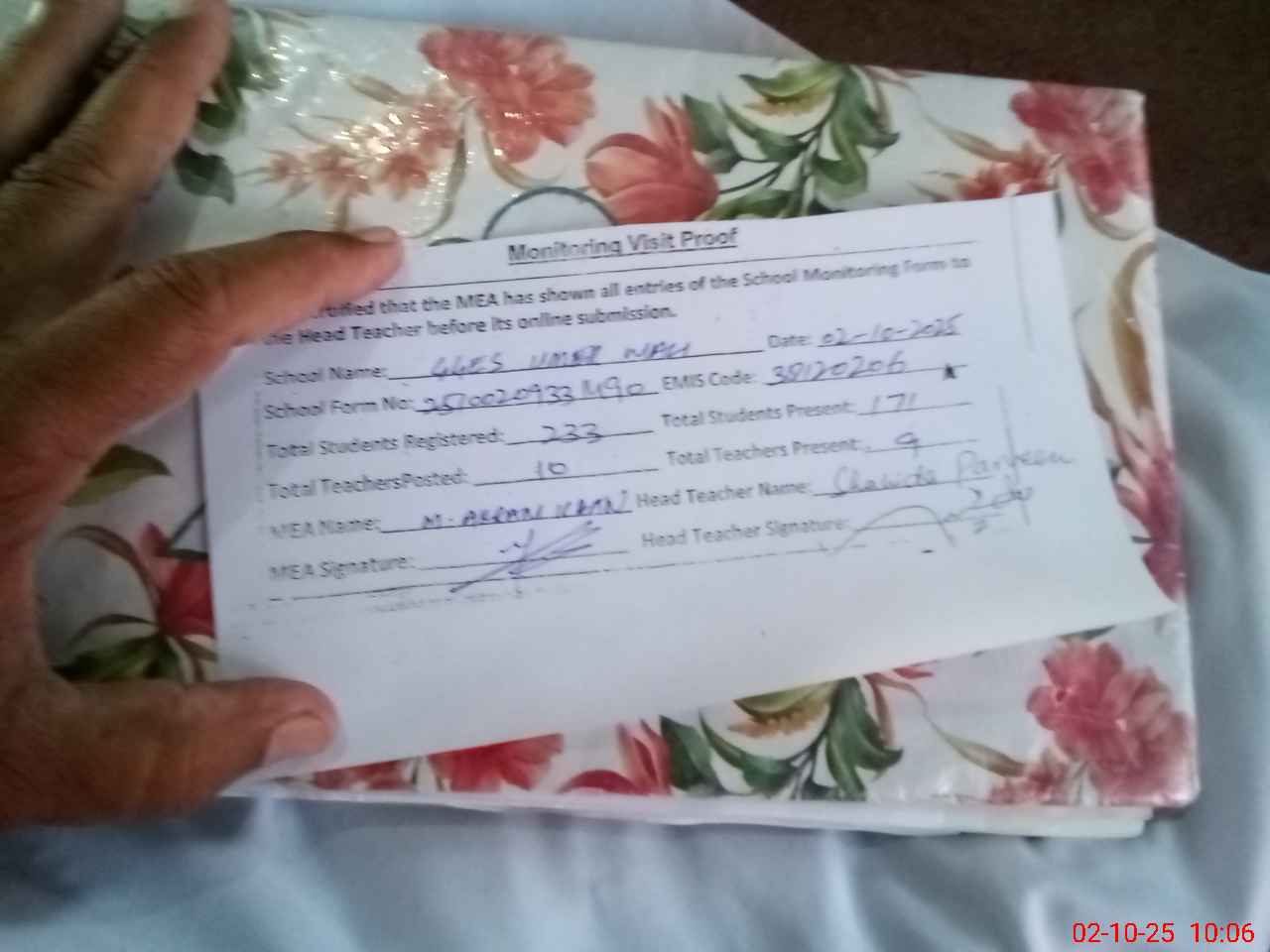 | Attendance Register | Head Teacher | MEA with School | Visit Proof |